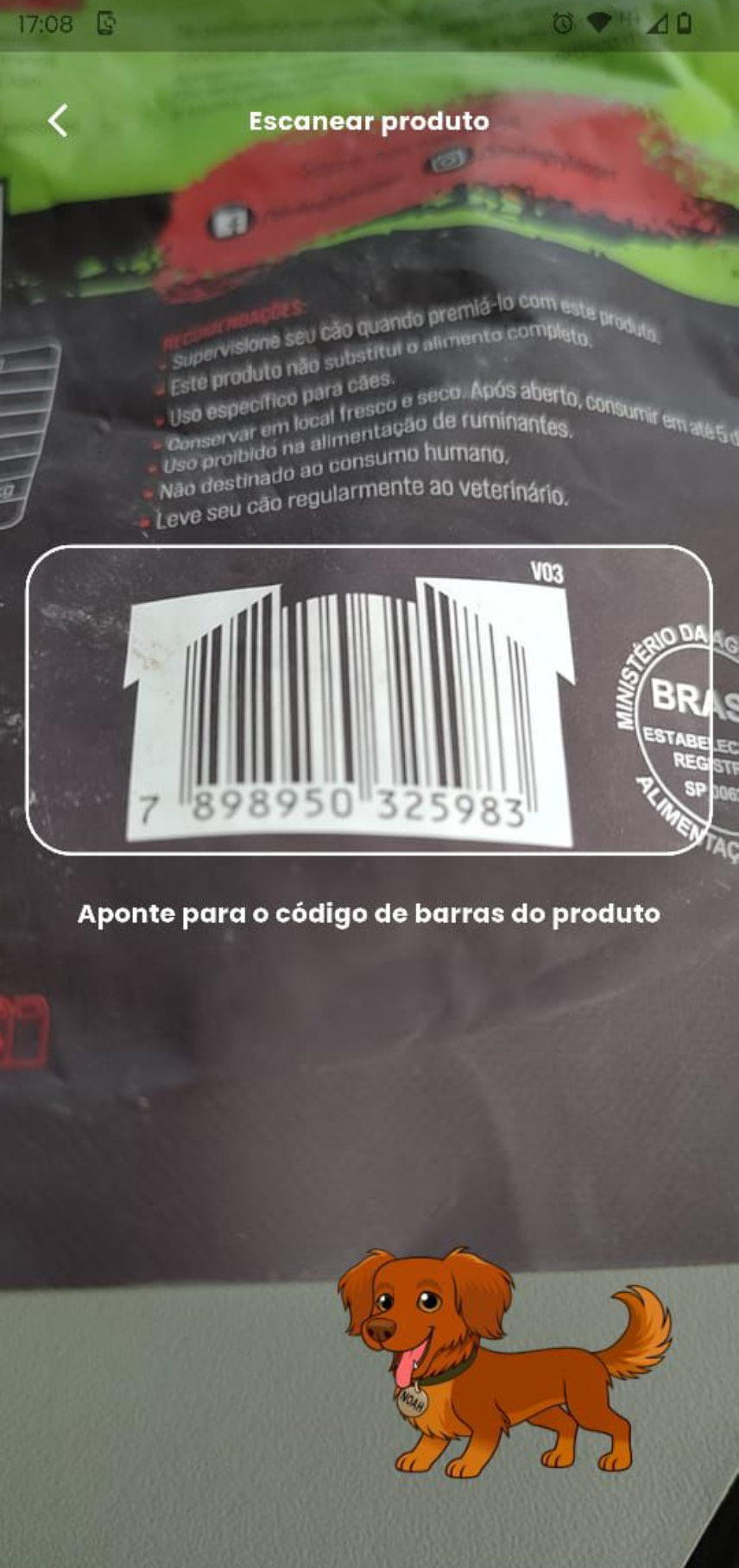 Basta escanear o código de barras do produto pet ou buscar pelo nome. O app exibe: