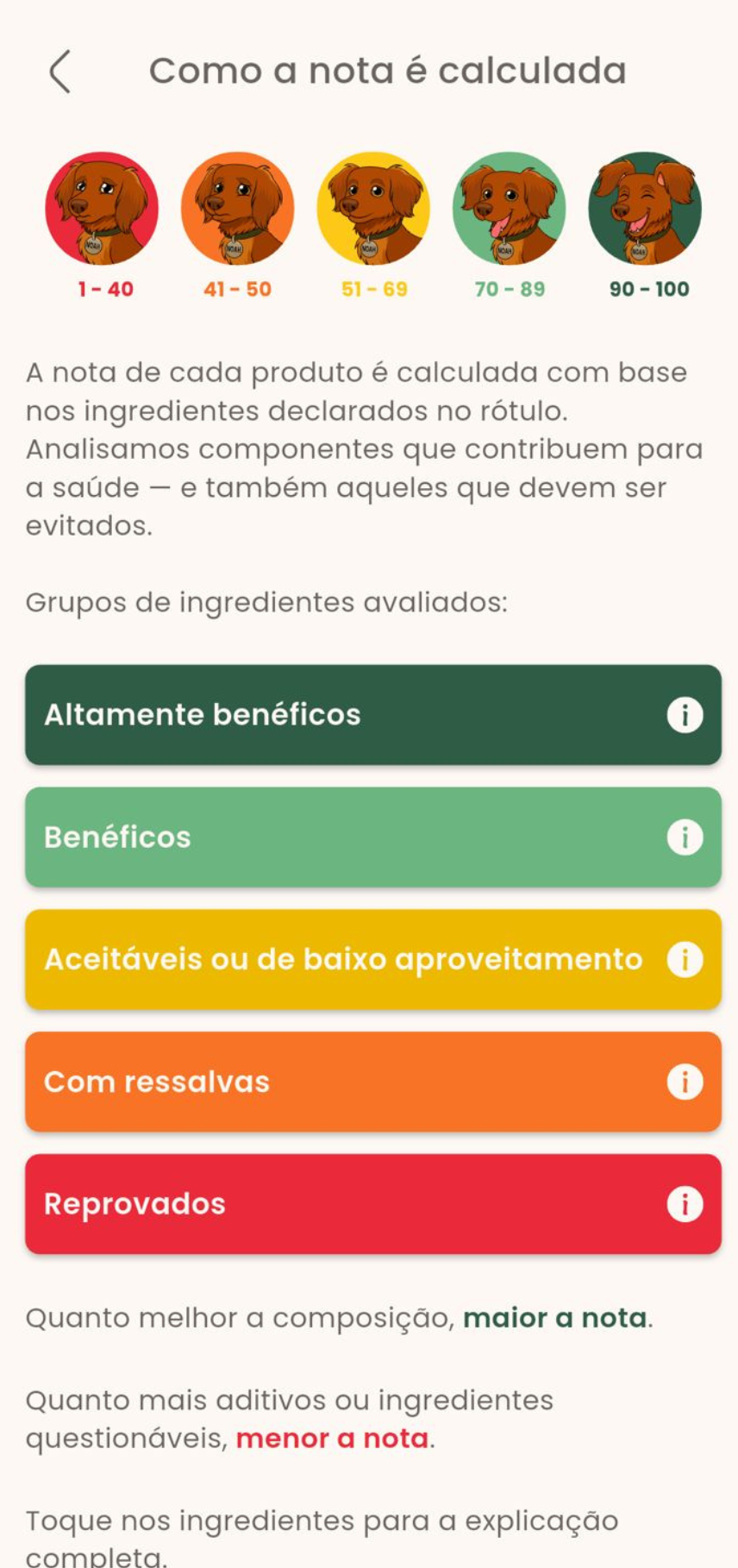 Receba a nota técnica de 1 a 100, a reação do mascote Noah e frases emocionais que resumem a qualidade. E mais: veja a explicação de cada ingrediente, alertas nutricionais educativos, sistema de cores, opção de explorar outros produtos da mesma categoria e muito mais. Tudo pensado para facilitar sua escolha com consciência e carinho.